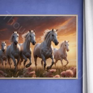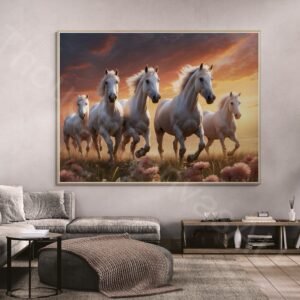 Vibrant Horse Meadow Print: White Horses Running at Sunset, Flowing Mane Equine Decor, Instant Download