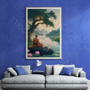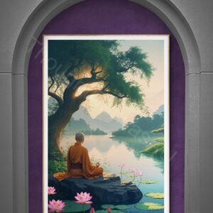 Tranquil Meditation Print: Monk Figure Sunrise Lake Art, Zen Lotus Flower Digital Download